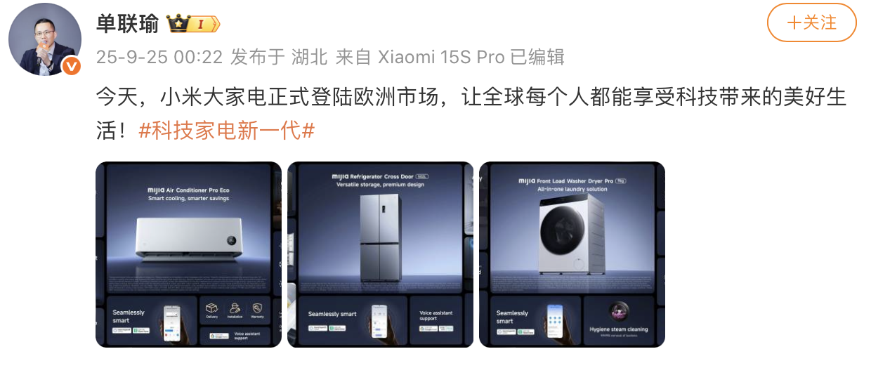 9月25日,小米集团大家电部总经理单联瑜在社交账号发文称,“今天,小米大家电正式登陆欧洲市场”。其配图显示,此次产品包括空调、冰箱、洗衣机等。